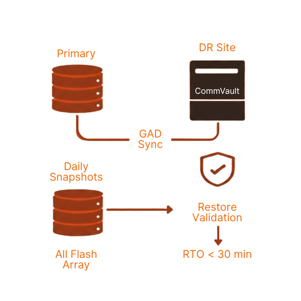 In partnership with a national bank, we designed a multi-site backup topology using GAD replication and air-gapped vaults. Daily snapshots from primary SANs stream to a secured DR facility, while our automated restore validation drills ensure sub-30-minute RTOs—every time.